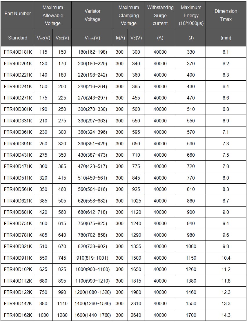 简要描述:压敏电阻 FTR40D162K 162KD40