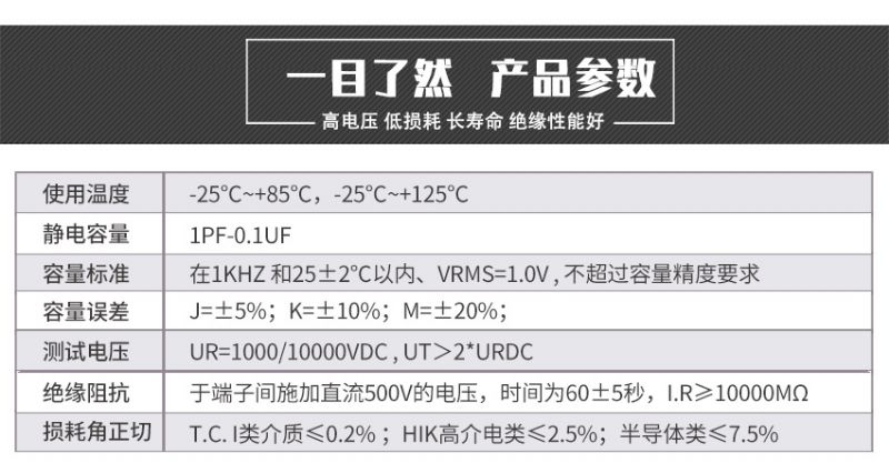 产品特性:高频损耗小、稳定性好、体积小、耐压高、介质损耗低、频率特性优良、过电流大、电压特性好。