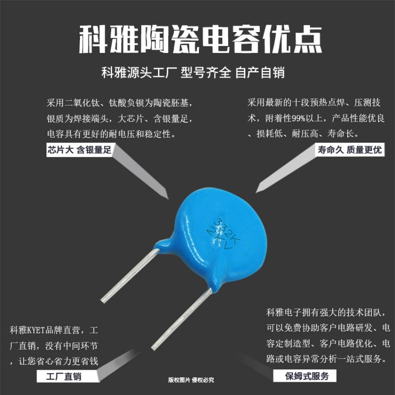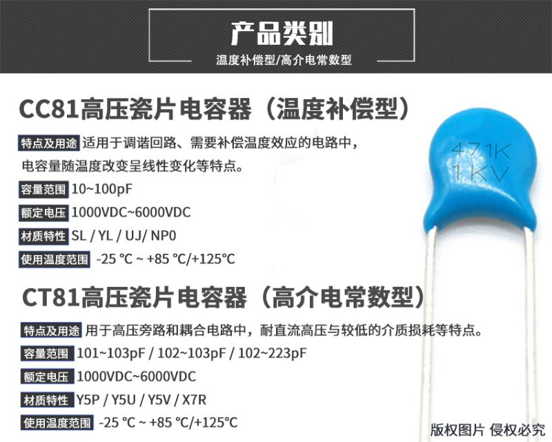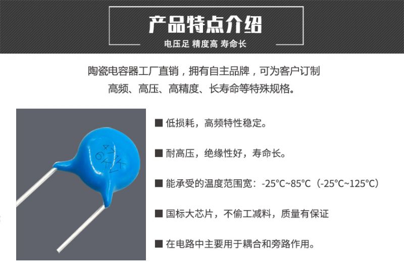 产品作用:适用于高压旁路和耦合电路中.其中的低损耗高压圆片瓷介电容器具有较低的介质损耗,特别适合在电视接收机的行扫描等电路中使用。用于高频、直流、交流和脉冲电路中,大电流场合