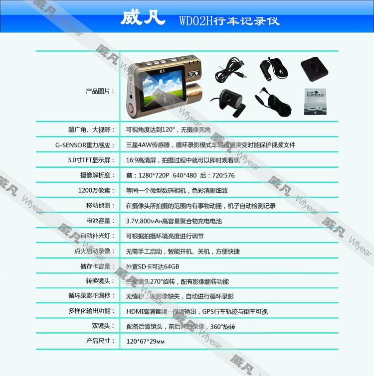 简要描述:高清 广角 夜视 行车记录仪 车载摄像机 WD02H