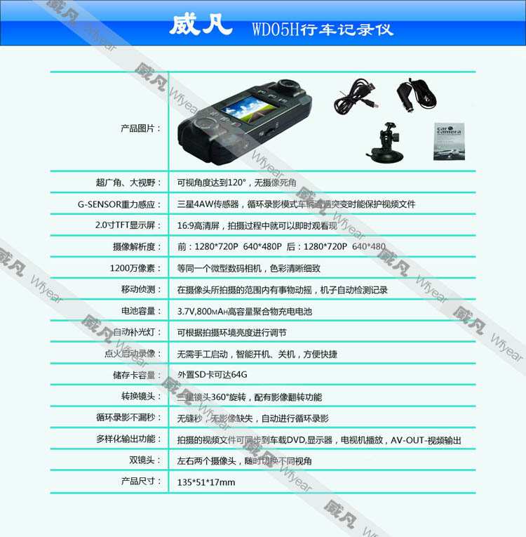 简要描述:高清 广角 夜视 行车记录仪 车载摄像机 WD05H 双录